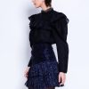 DescriptionWoven viscose top with peplum, high neck and crochet trim details.