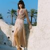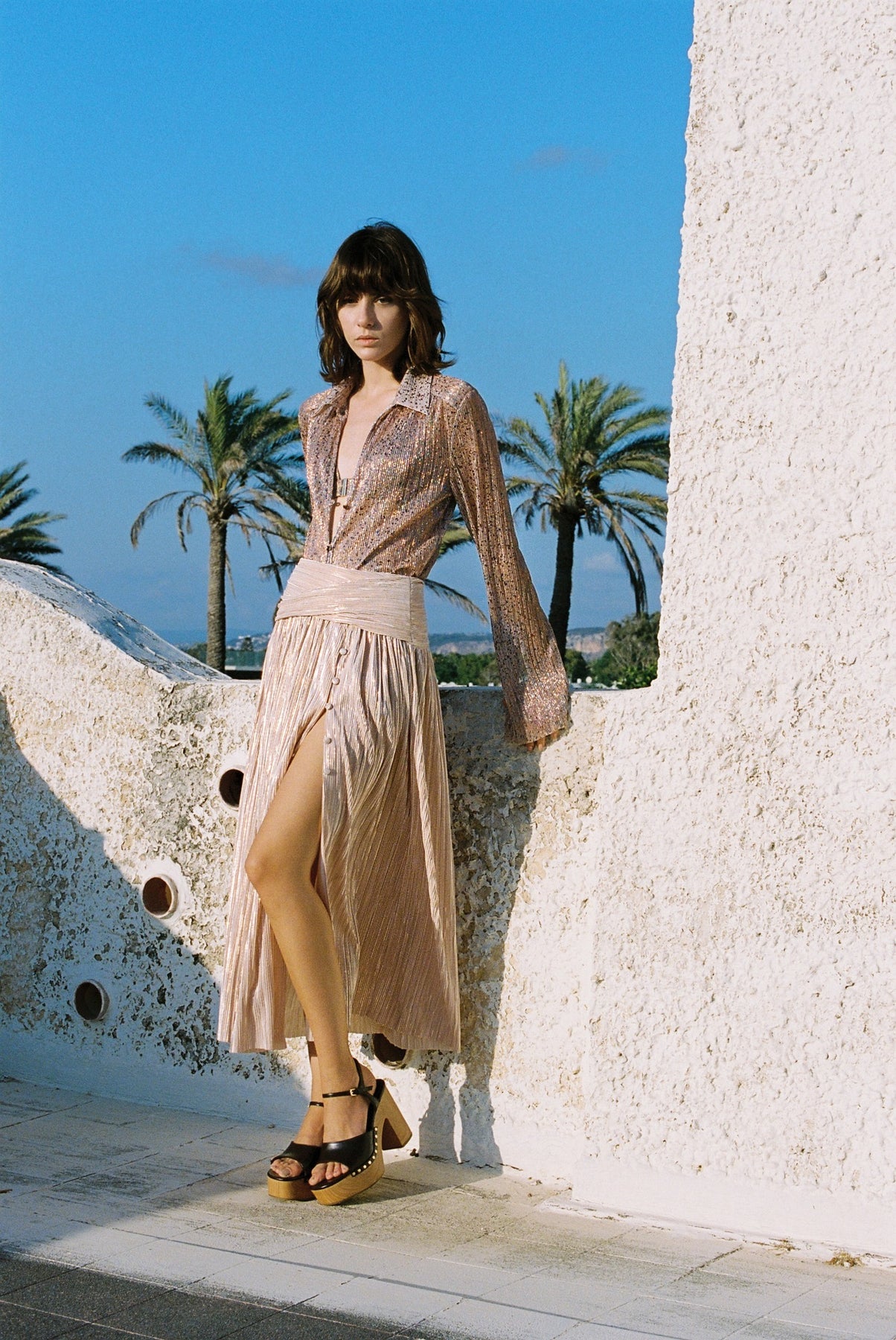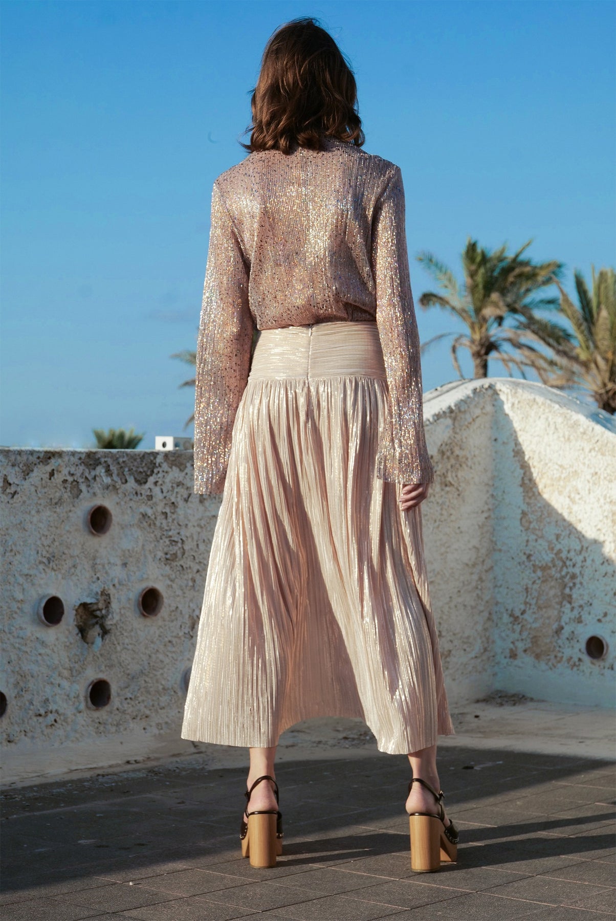 Pleated knit with foil midi skirt with fitted waist, and a side slit.