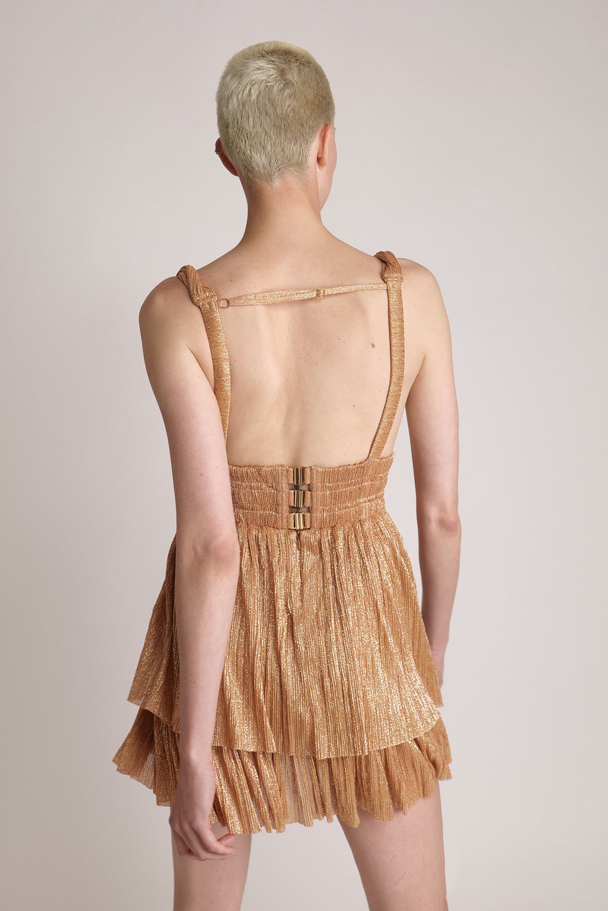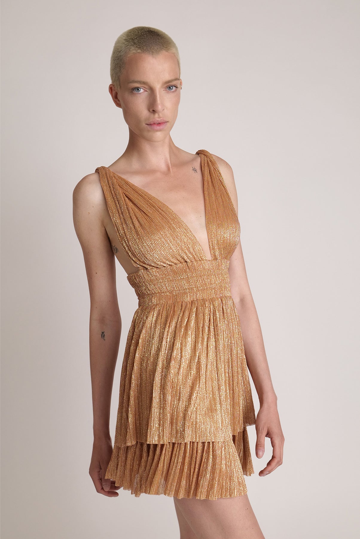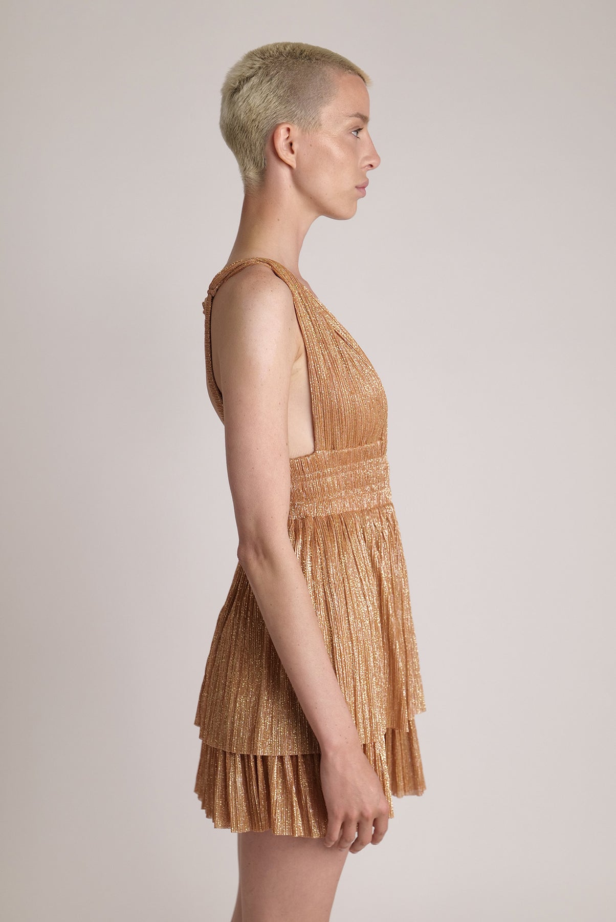 Ray lurex with sprinkled foil layered mini dress with elastic waist, invisible zipper at the back.