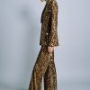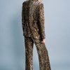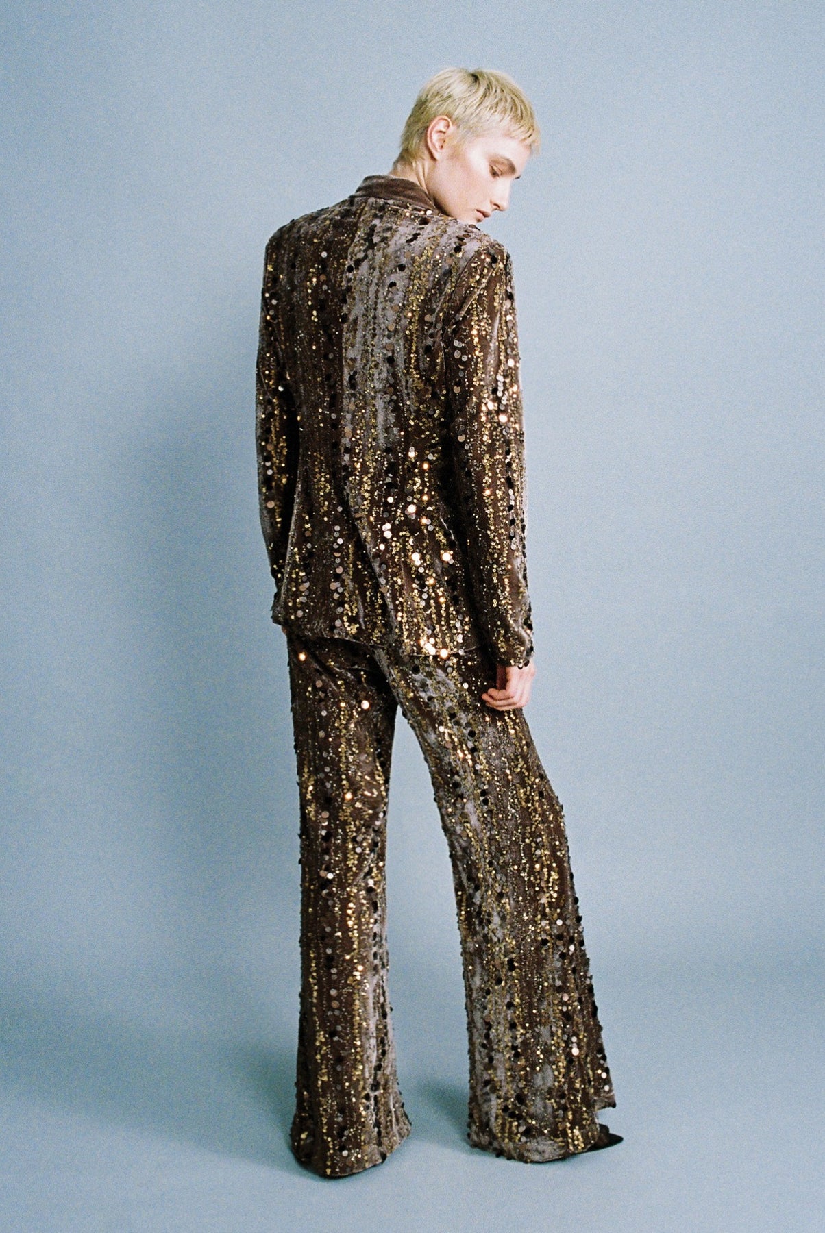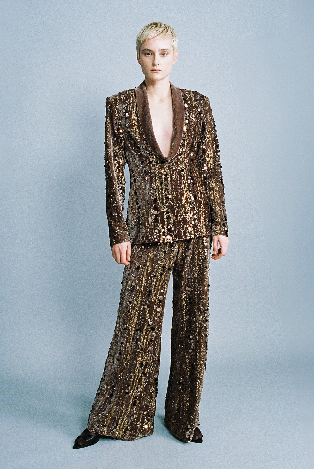 Stripe sequins on velvet top with deep V – neckline, long sleeves, and flap pockets.