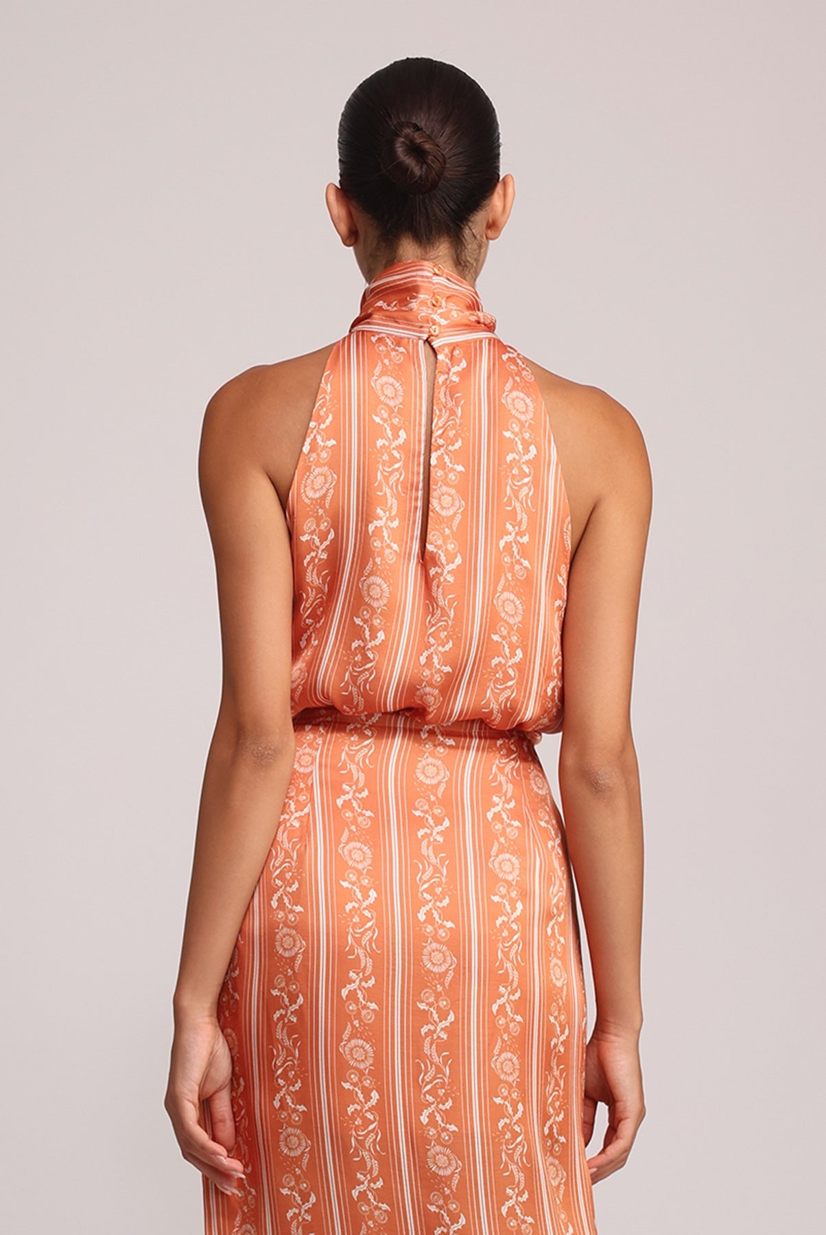 - Halter neck featuring three buttons at the back.