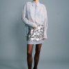Rayon with lurex blend a pencil skirt with gathering details, front slit, and invisible zipper at the back.