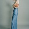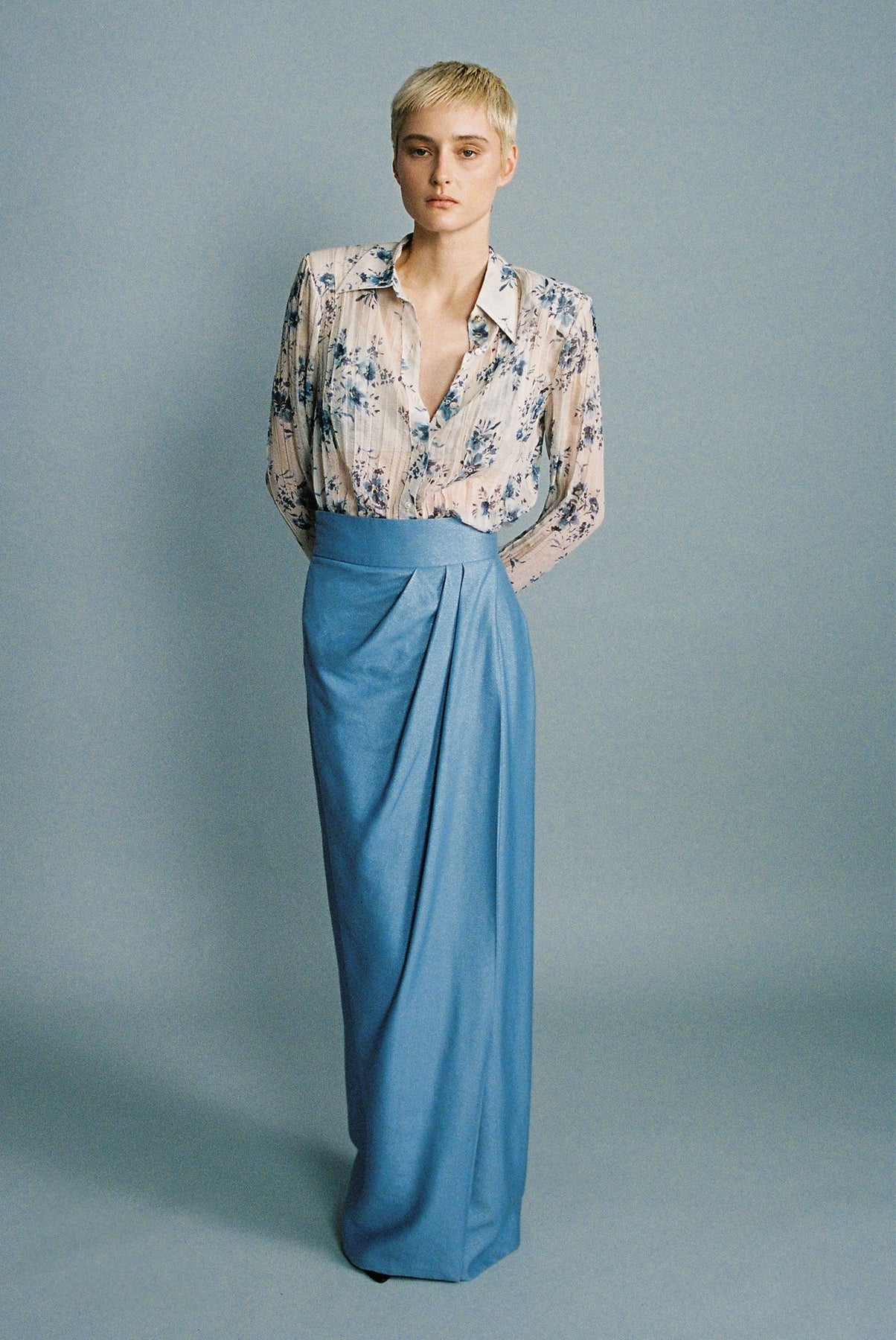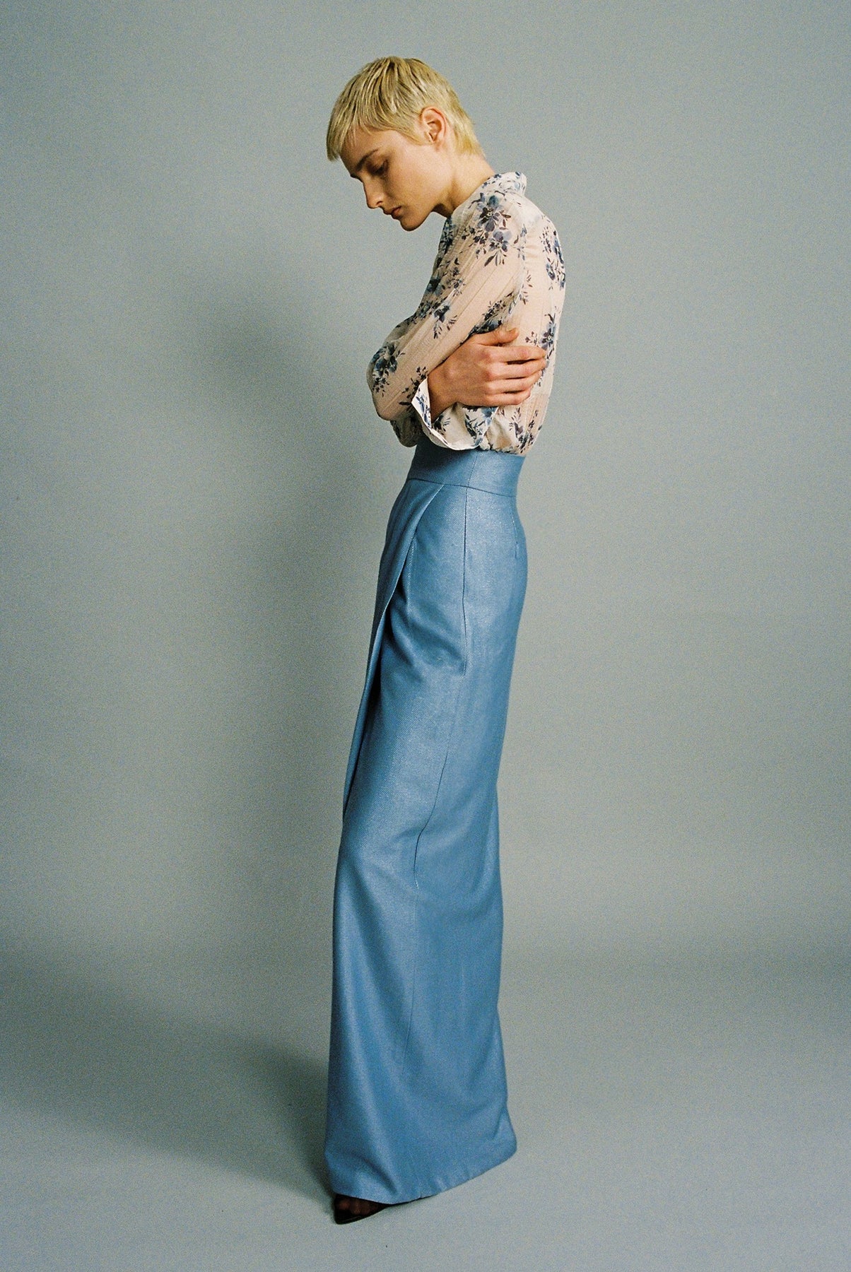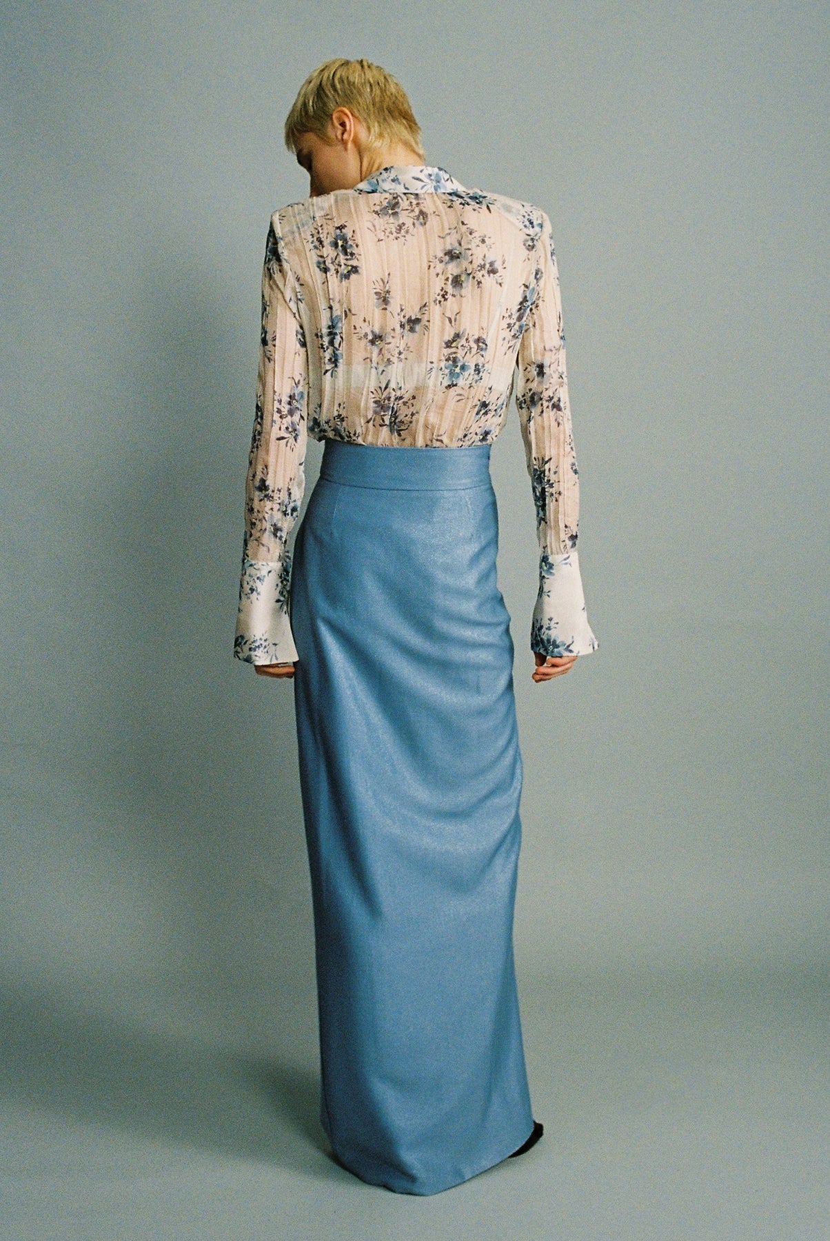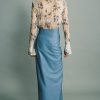 Rayon with lurex blend a pencil skirt with gathering details, front slit, and invisible zipper at the back.