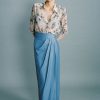 Rayon with lurex blend a pencil skirt with gathering details, front slit, and invisible zipper at the back.