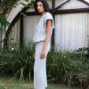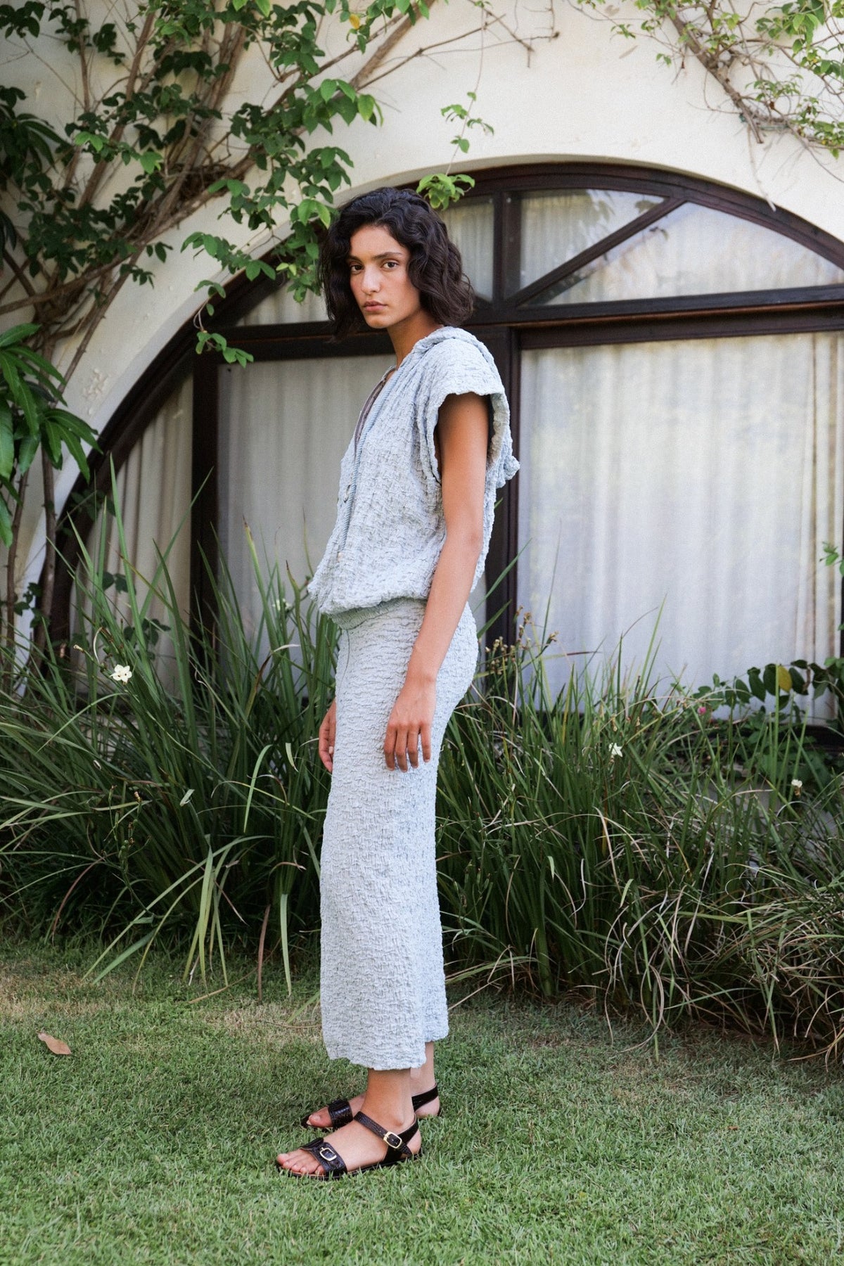 Crinkled knit pencil midi skirt with an elastic waistband and a front slit.