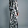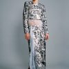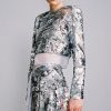 Gradient sequins on chiffon crop top with long sleeves, and open back.
