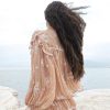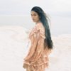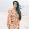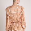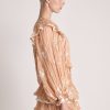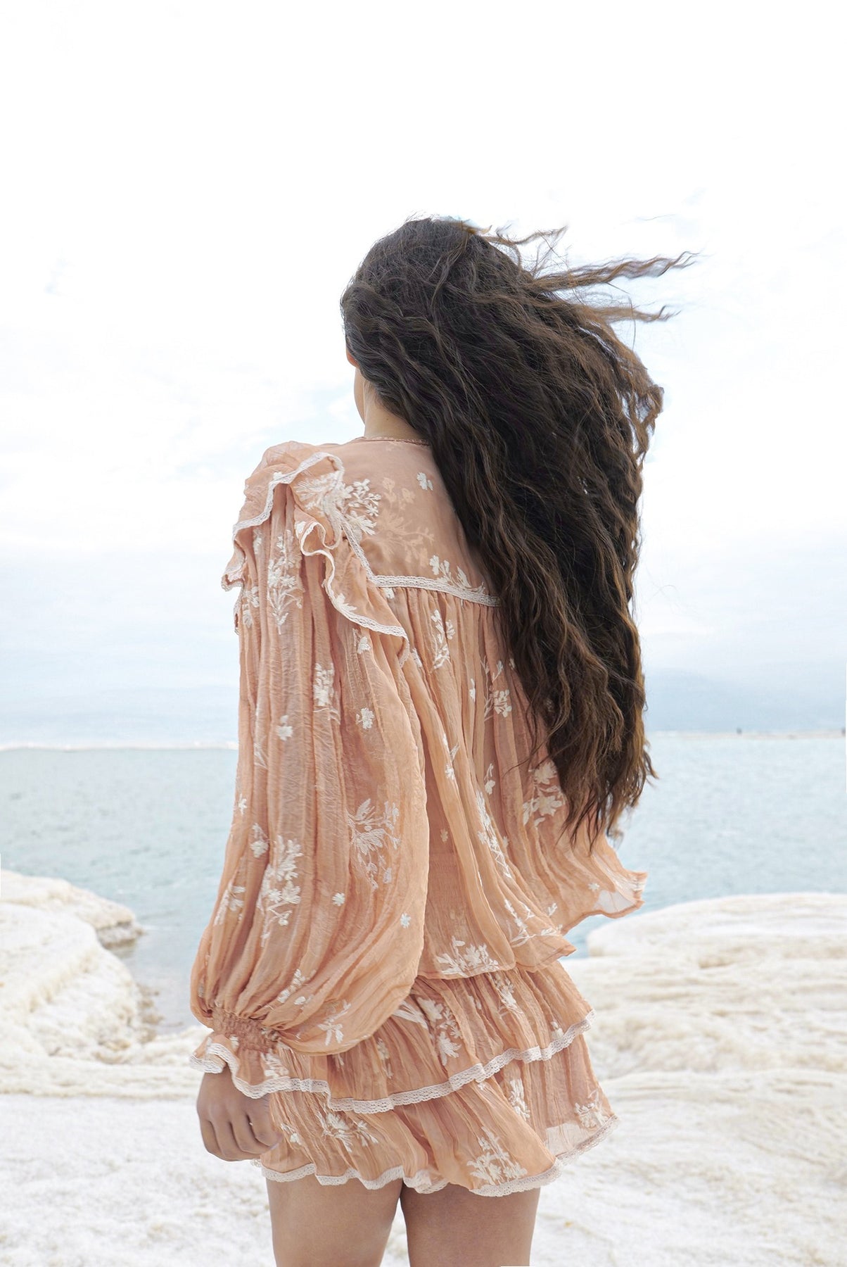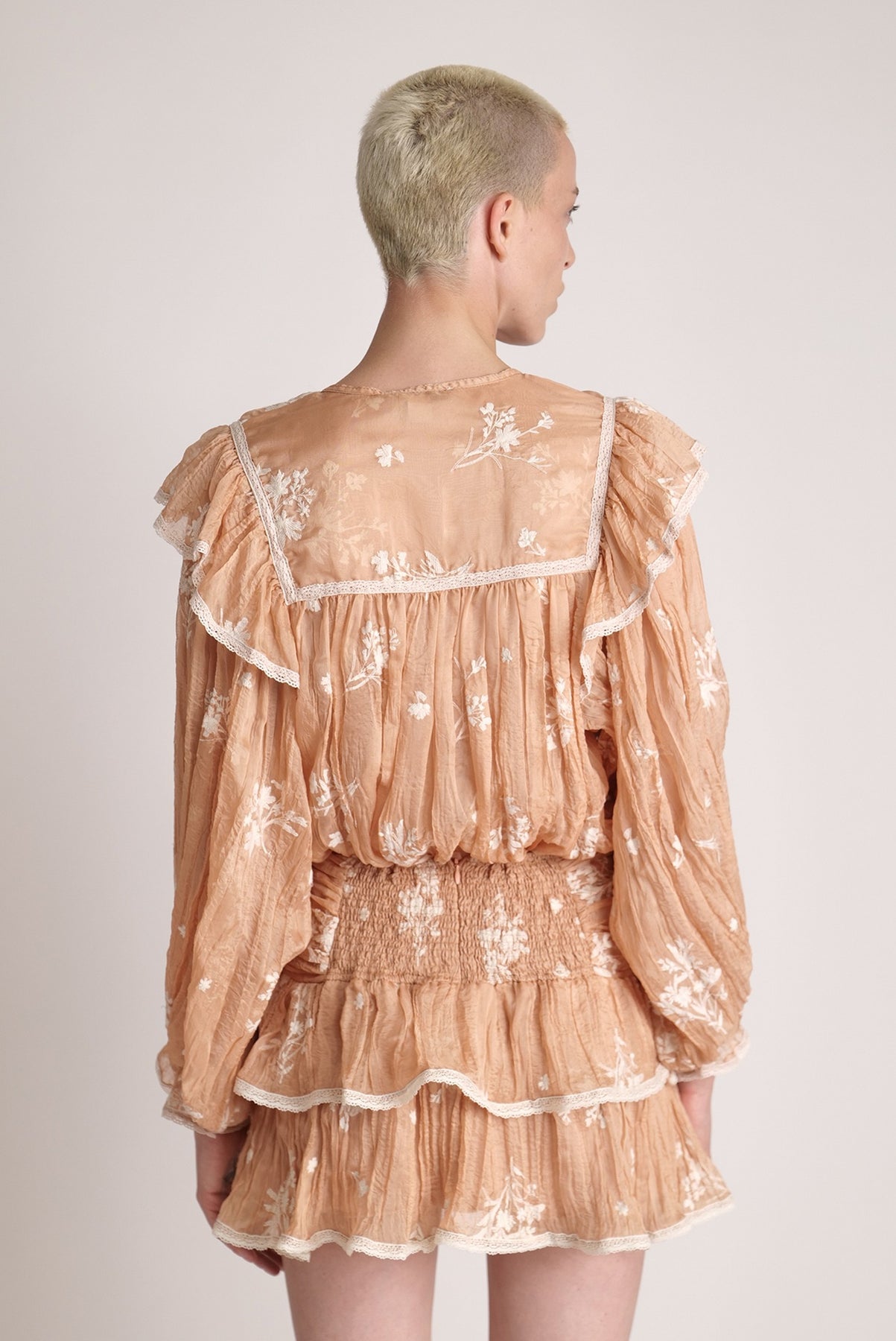 Pleated chiffon with embroidery Short high-waisted skirt with fitted waist and ruching at center front. Gathering details and invisible zipper at center back.