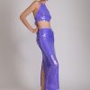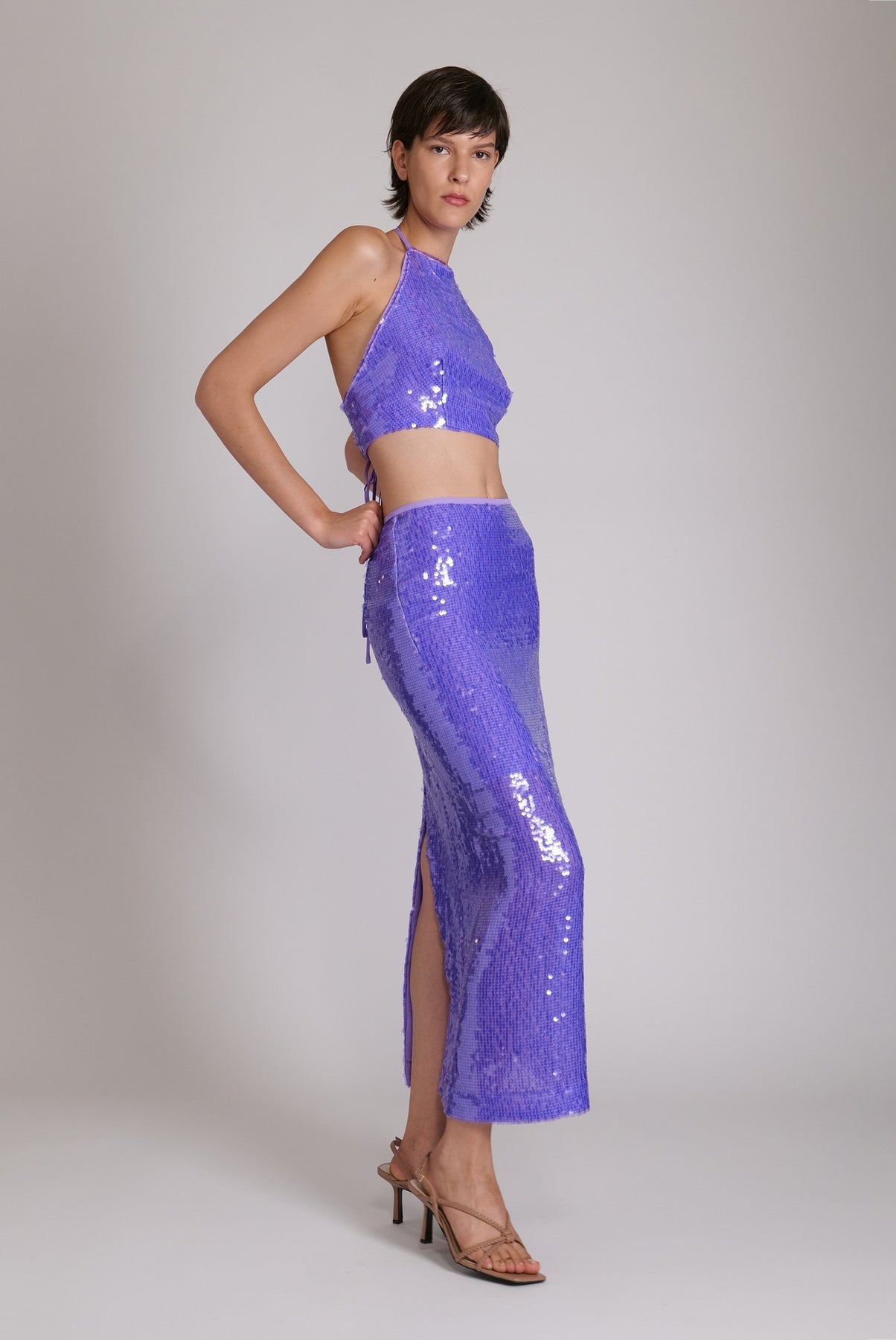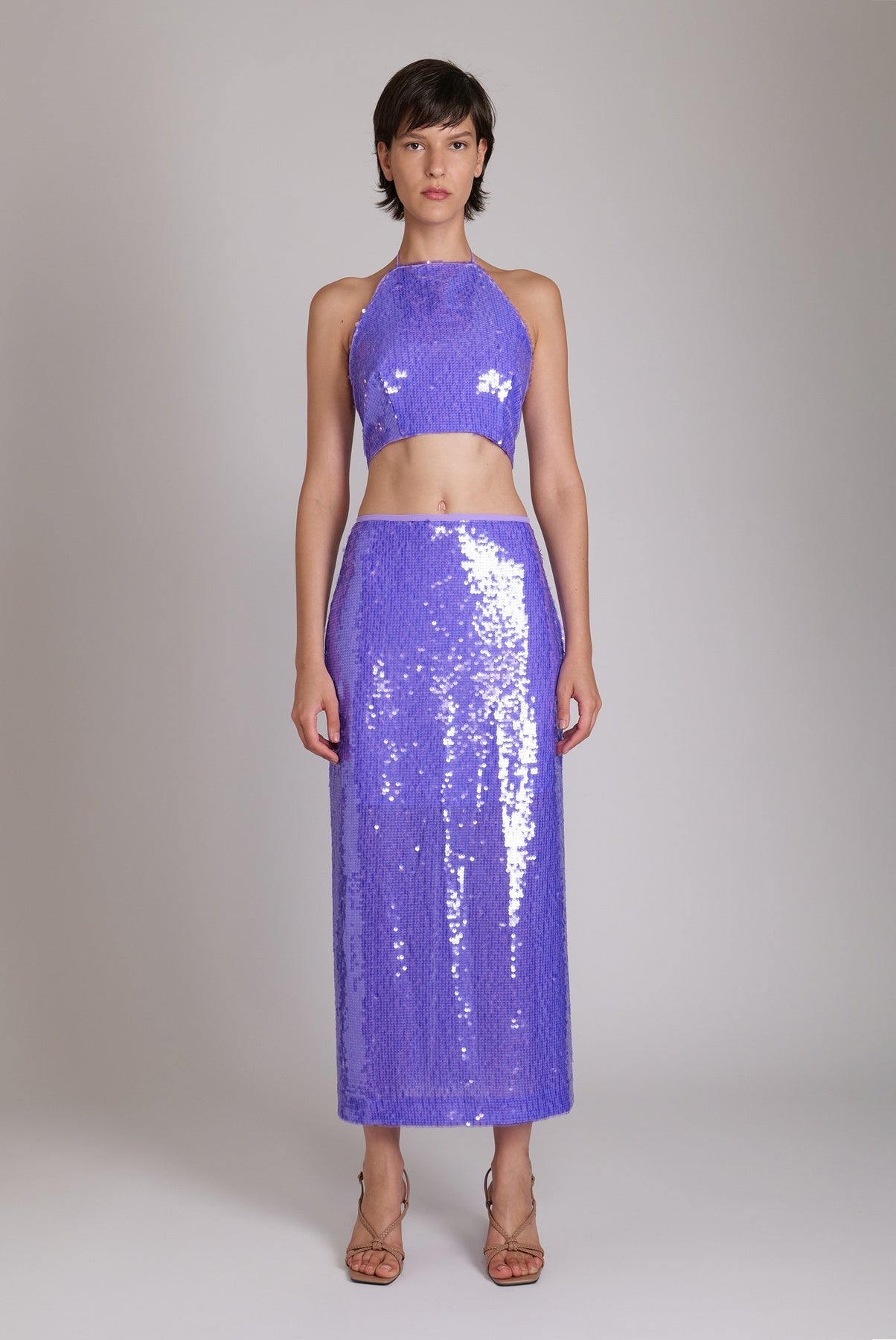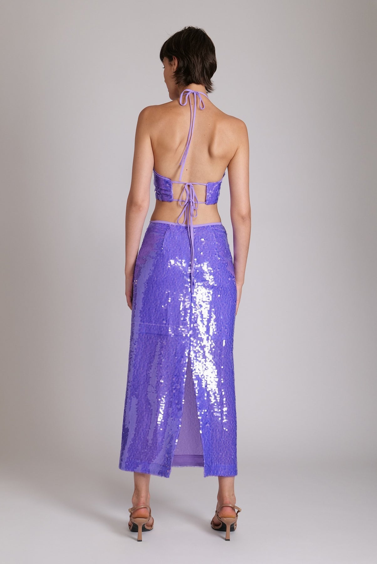 High-waist sequined midi skirt back slit, matching lining and invisible back zip fastening.