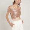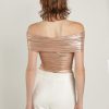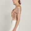 Foil pleated knit off-the-shoulder top featuring twisted front detail.