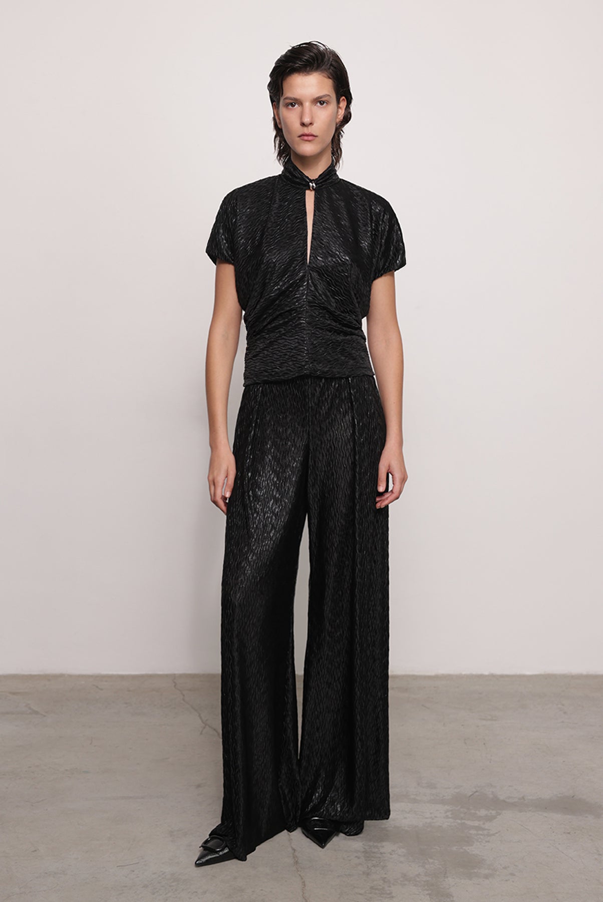 - Evening pleated knit with foil pants by Sabina Musayev.