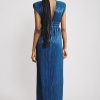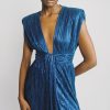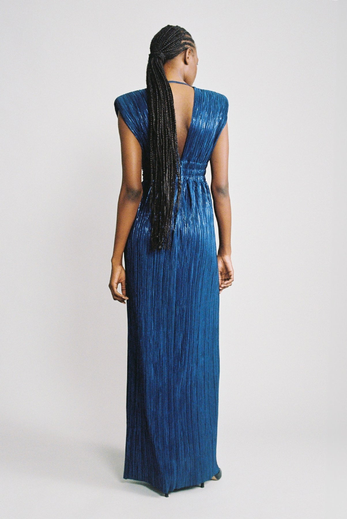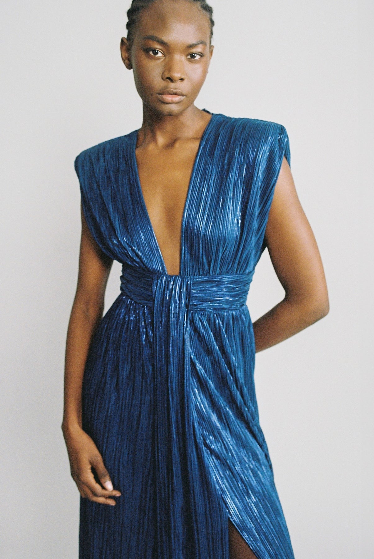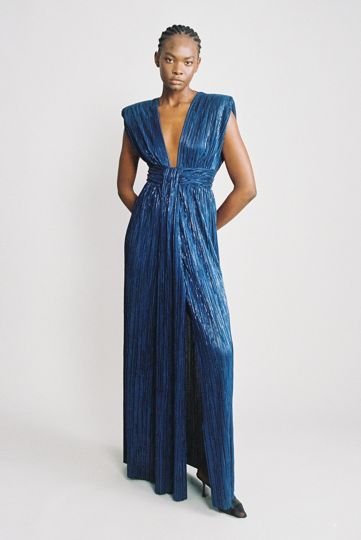 Pleated knit with foil sleeveless maxi wrap dress featuring a deep V-neckline, shoulder pads, and front slit. Draped fabric detail at front.