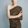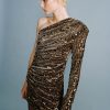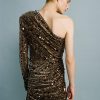 Stripe sequins on velvet mini dress featuring asymmetric neckline, long sleeve, and invisible side zipper.