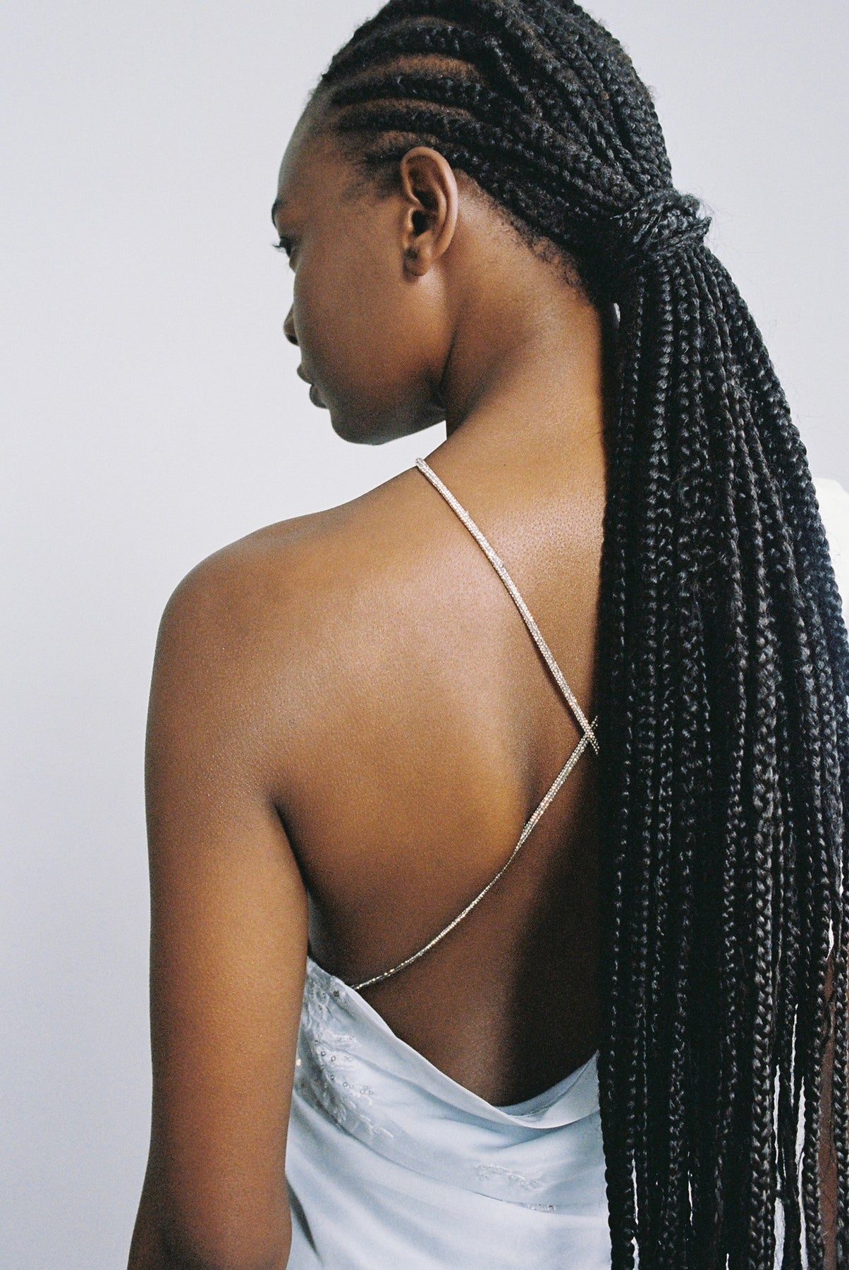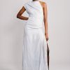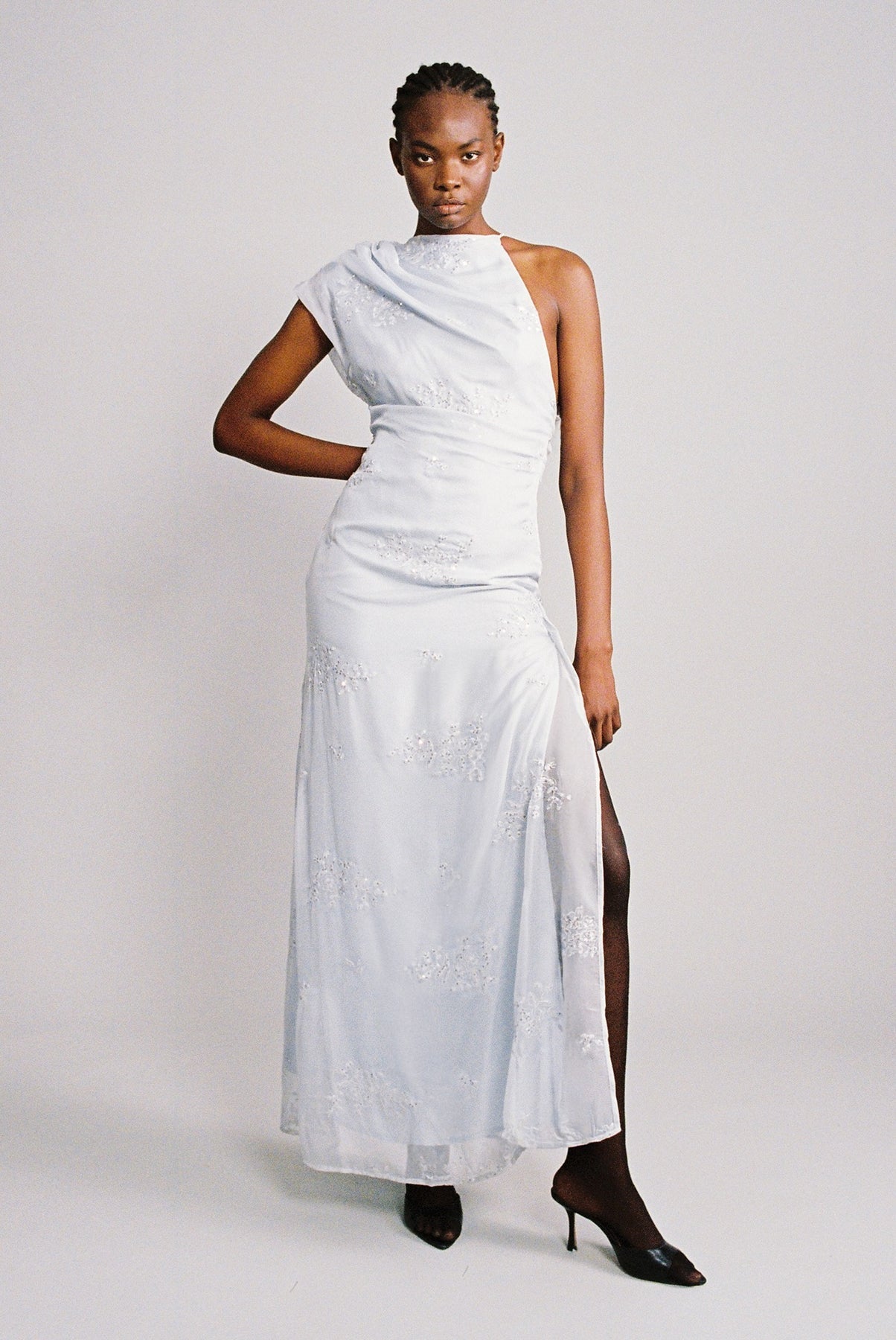 Embroidered chiffon maxi dress featuring an asymmetrical round neck, drop sleeve with gathered detail, open back, and invisible zipper at the side.
