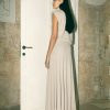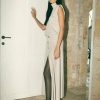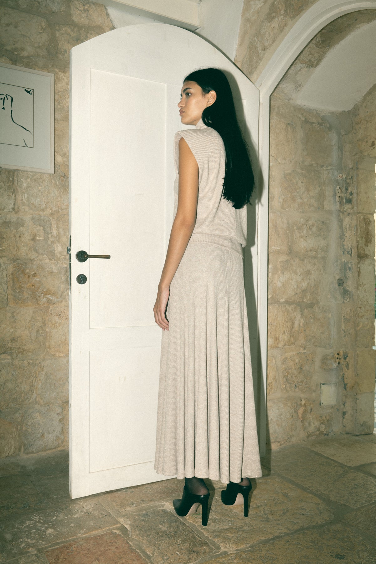 Lurex rib knit midi skirt with front slit, and multipleunique metallic buttons.