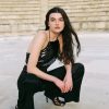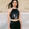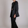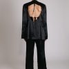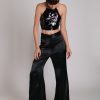 High-waist satin flared trousers with side vents and satin covered buttons, zip fly and matching covered button fastening.